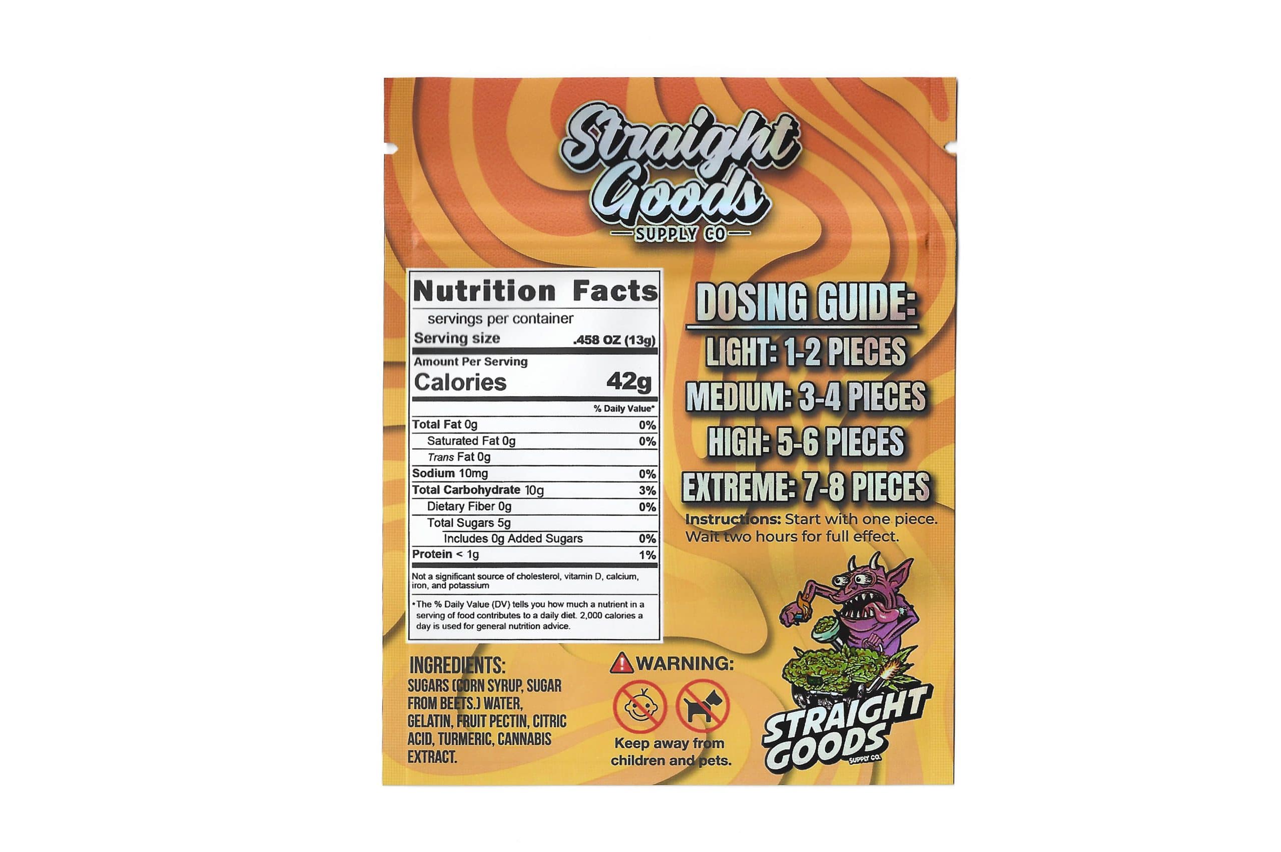 Ingredients: Sugars (Corn Syrup, Sugar from Beets. Water, Gelatin, Fruit Pectin, Citric Acid, Anattoe Seed, Cannabis Extract.
